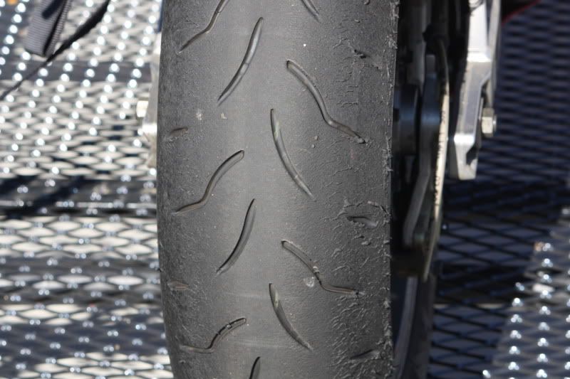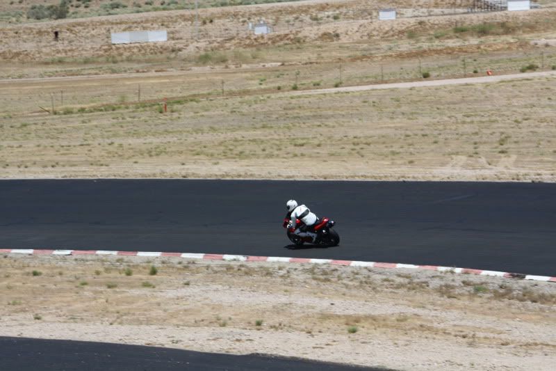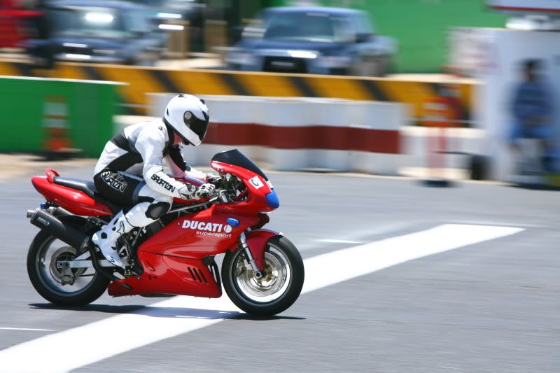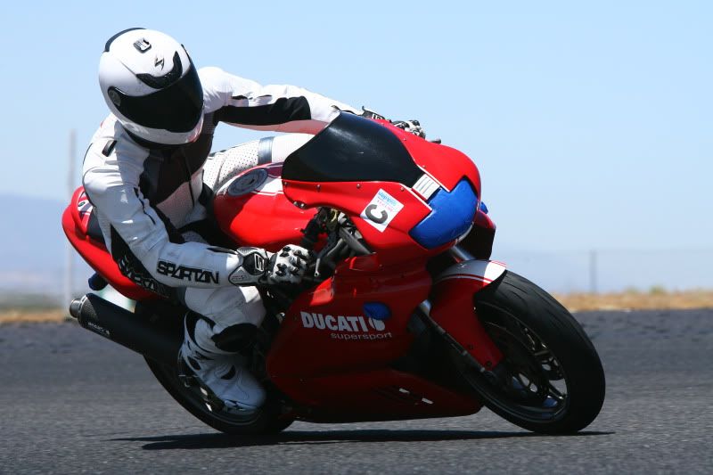 Not as exciting as I had hoped for! Going around the track, averaging 75mph (a friend timed a few laps for me), wasn't as adrenaline filled as I expected with three times the horsepower and tons more torque than the ninja. I'm thinking it is a combination of a relatively boring track (looooong curves that seemed to go forever), not being as comfortable with the Duc as the ninja, and not really pushing myself to the limit (crashing is bad Wink ). I was going ~100mph around turn 8, and it just didn't feel very fast! It was still lots of fun, just not like I expected it to be. The weather was gorgeous, and I burned probably four gallons of gas for the 104 miles I went! Got some awesome pictures out of it though -